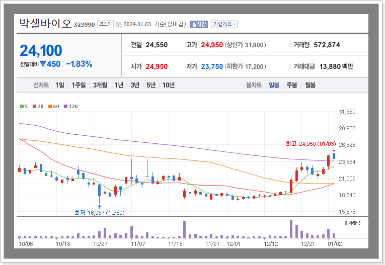 이러한 소식이 전해진 데 따라 2023년 12월 중순 18,000원 선에 머무르던 박셀바이오 주가는 2024년 1월 3일 장중 25,000원선에 근접할 정도로 단기간에 급한 상승세를 나타낸 바 있습니다.