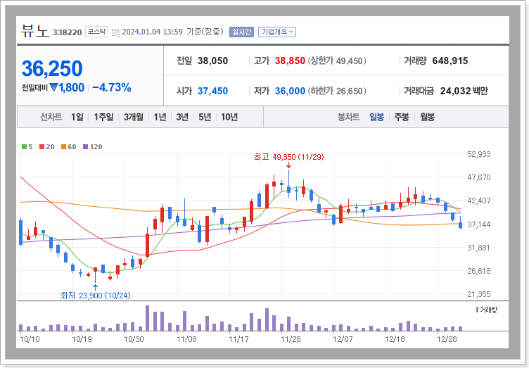 이러한 전망이 힘을 입은 데 따라 2023년 8월 중순 32,000원 선에 머물렀던 뷰노 주가는 2023년 9월 7일 장중 7만 원 선에 근접할 정도로 급격한 오름세를 나타냈지만, 재료 소멸과 차익실현 매물 출현 등으로 인하여 하락 후 현재는 36,000원 선 부근에서 움직이고 있습니다.