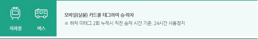 기후동행카드 사용방법은 기존 교통카드와 동일하게 승차 및 하차 시 태그를 하면 됩니다. 다만, 하차 시 미태그 2회가 누적되면 직전 승차 시간 기준으로 24시간 동안 사용이 정지된다고 하니 주의해야겠습니다.