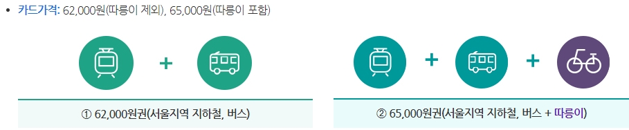 62,000원으로 위 이용 범위에 해당하는 대중교통을 30일간 무제한으로 이용할 수 있으며, 3천 원을 추가로 내면 서울 자전거 대여 서비스인 따릉이를 무제한으로 이용할 수 있습니다.