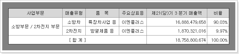 소방차 제조부문에서는 화재 및 구난 등 현장용 소방 차량 등을 제조하여 국가 정부기관인 조달청 등에 납품하는 사업을 진행하고 있습니다.