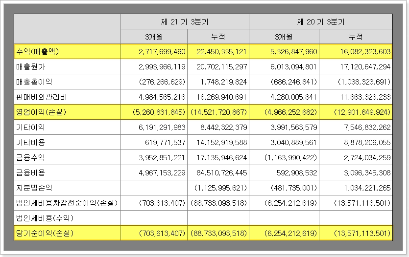 실적을 살펴보면 2023년 3분기 연결재무제표 기준 매출액 225억 원, 영업손실 145억 원, 당기순손실 887억 원을 각각 기록했습니다. 전년 동기 대비 매출액은 39.6% 증가했으나 영업손실과 당기순손실은 각각 12.6%, 553.8% 확대되었습니다.