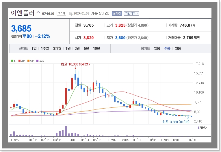 실사를 성공적으로 마치게 되면 대규모 투자를 받을 가능성이 높다는 전망이 힘을 얻게 되었고, 2023년 3월 초 4천 원 선에 머무르던 이엔플러스 주가는 2023년 4월 18일 장중 16,000원 선을 돌파하는 기염을 토했습니다.